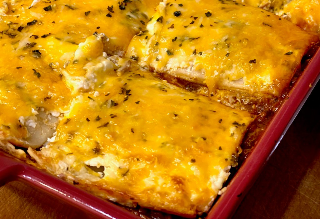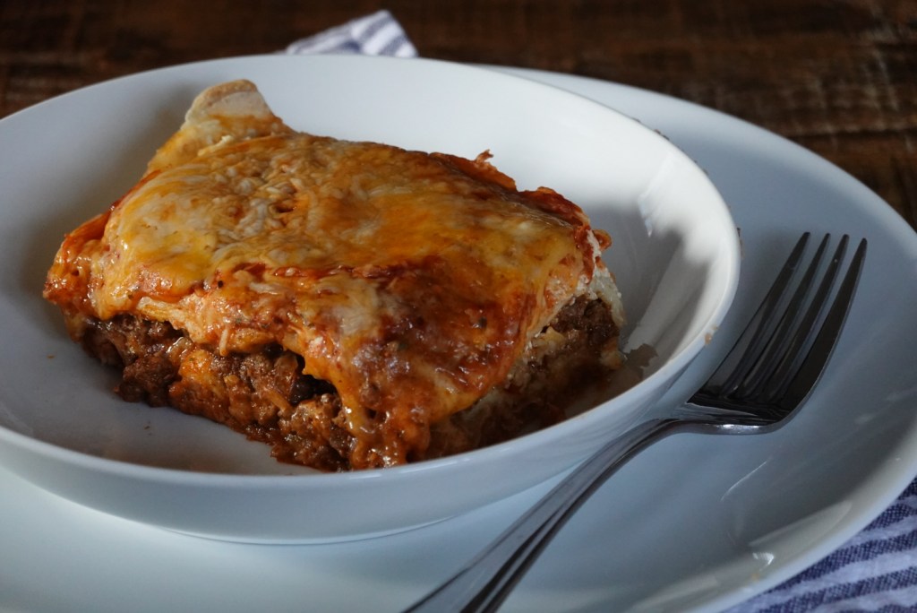 I’ve also seen this called Tortilla Pie or Layered Taco Casserole. Essentially Mexican Lasagna is layers of flour tortillas (like the lasagna noodles in regularly lasagna), and layers of cheese, beans, and beef, in between the tortilla layers.